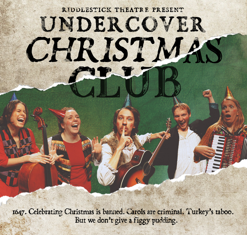 Undercover Christmas Club is a musical comedy inspired by mummers’ plays and based on the Puritan ban on celebrating Christmas in 17th Century England, in which a group of rebel performers put on a secret show featuring plays, songs, and interactive audience games.